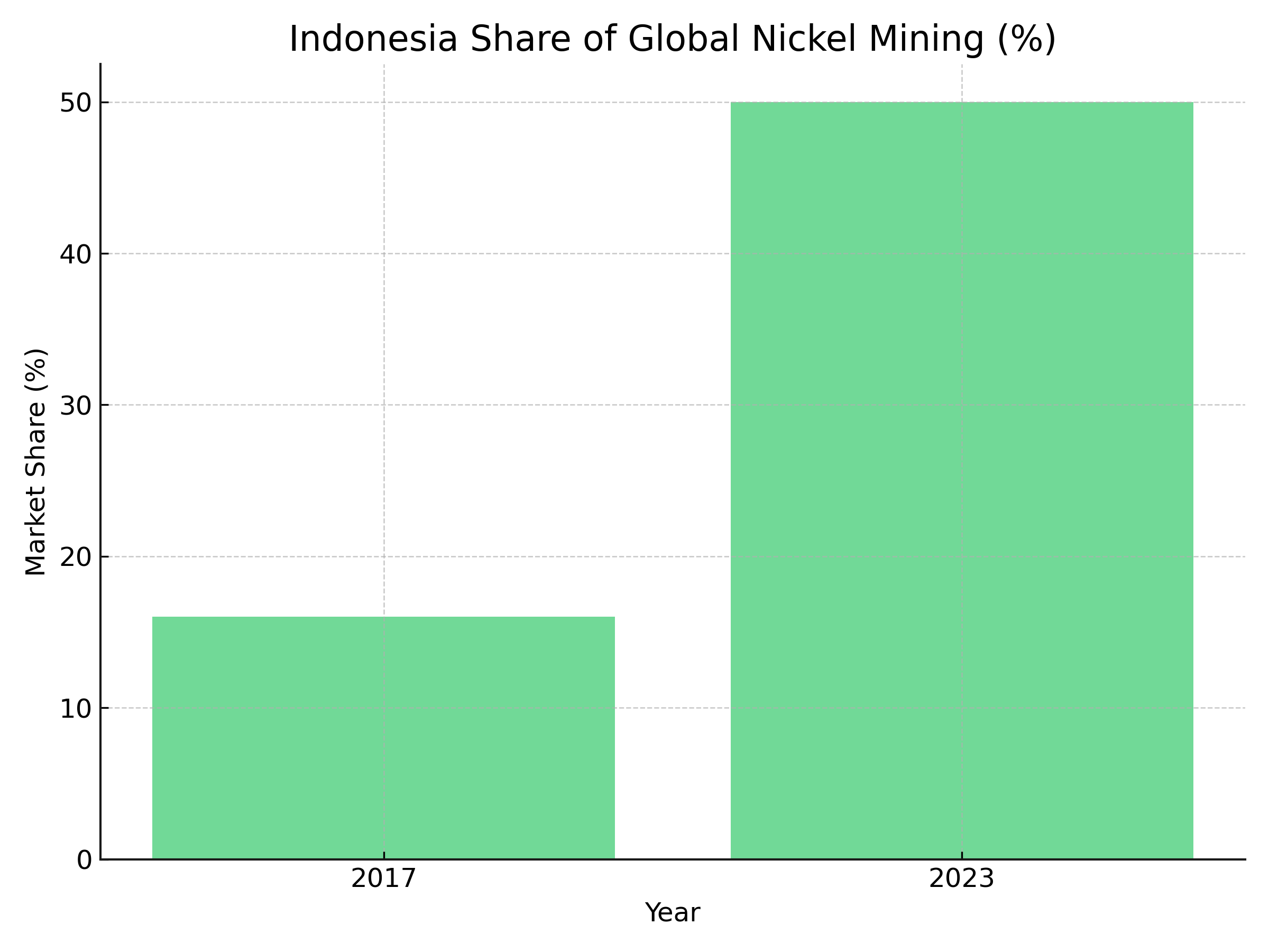 Indonesia’s Share of Global Nickel Mining (2017–2023). Source: Crux Investor Research