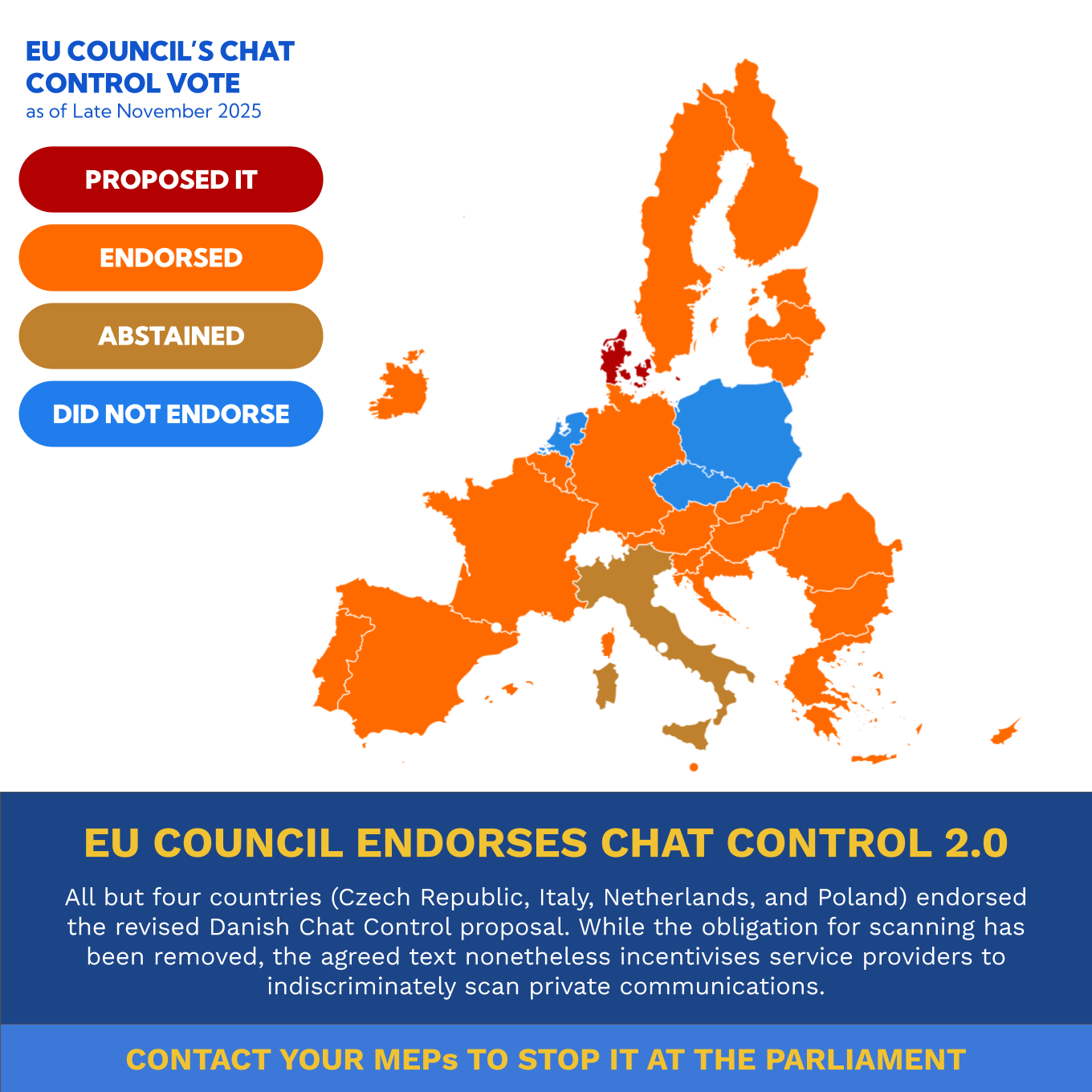 All but four countries (Czech Republic, Italy, Netherlands, and Poland) endorsed the revised Danish Chat Control proposal. While the obligation for scanning has been removed, the agreed text nonetheless incentivises service providers to indiscriminately scan private communications.