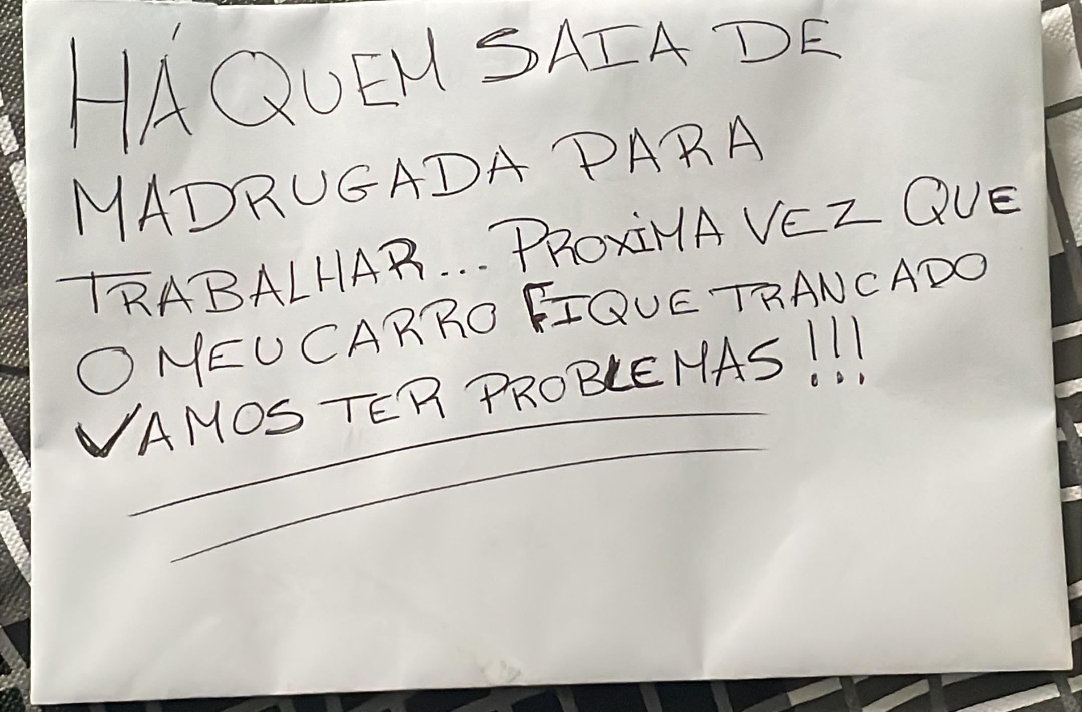 Porém ao tirar o carro (há coisa de 20 minutos sensivelmente) vi que havia algo no pára-brisas , eu pus me logo a pensar “será uma multa?” Mas eu tirei e comecei a ler e entendi logo quem tivesse sido pois o carro do indivíduo já não estava lá! Era d@ don@ de um tesla que deixou o carro atravessado no passeio e ainda se acho no direito de me deixar um bilhete desses, como se el@ estivesse bem estacionado!