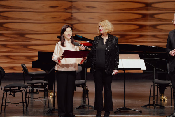 Yu Hongmei (left), president of the Central Conservatory of Music, at the competition in Vienna, Austria, on Sunday. [Photo provided to chinadaily.com.cn]