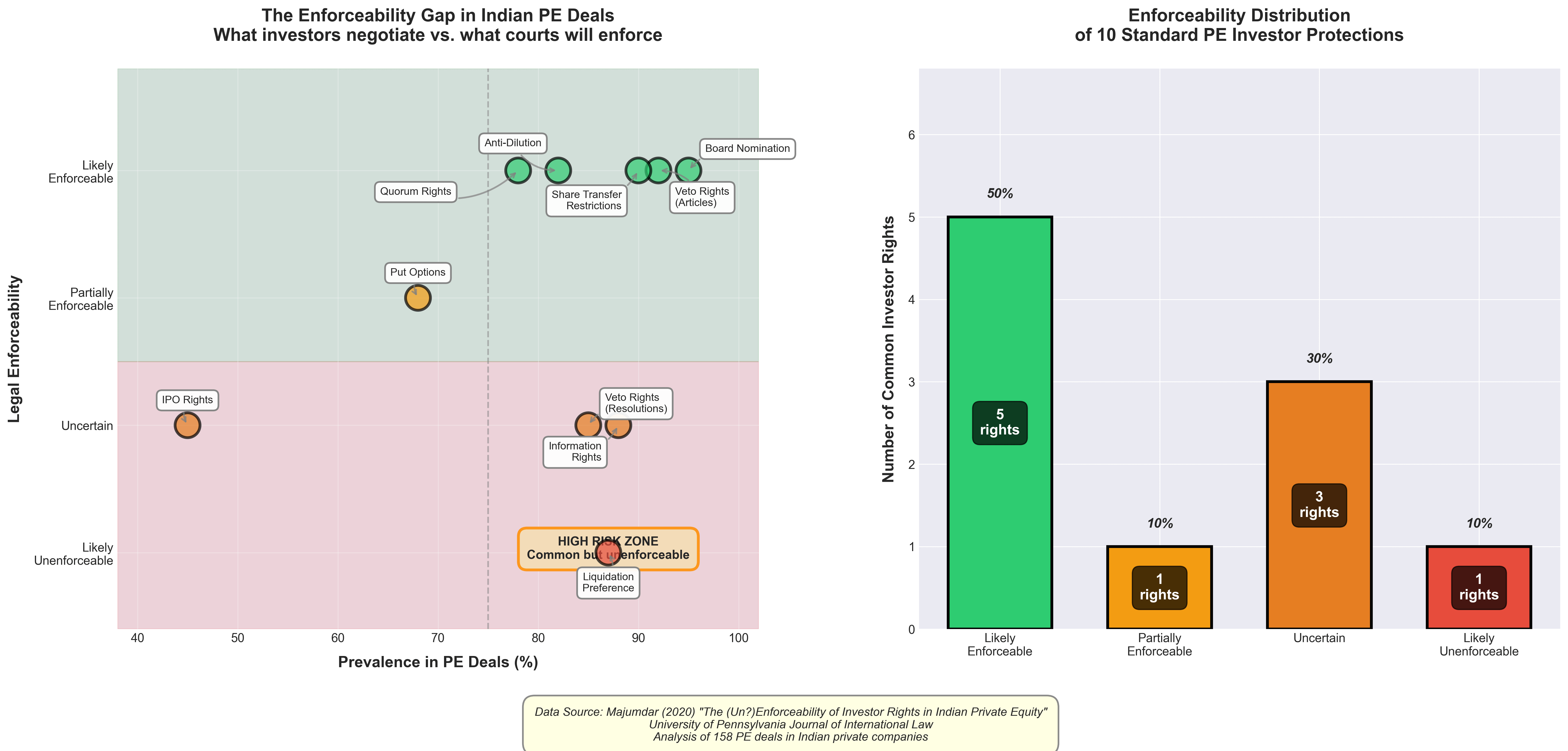 I analyzed data from an academic study that examined 158 PE investments in Indian private companies. The researchers compared what investors typically negotiate for against what's actually enforceable under Indian corporate law based on statutory provisions and court precedent.