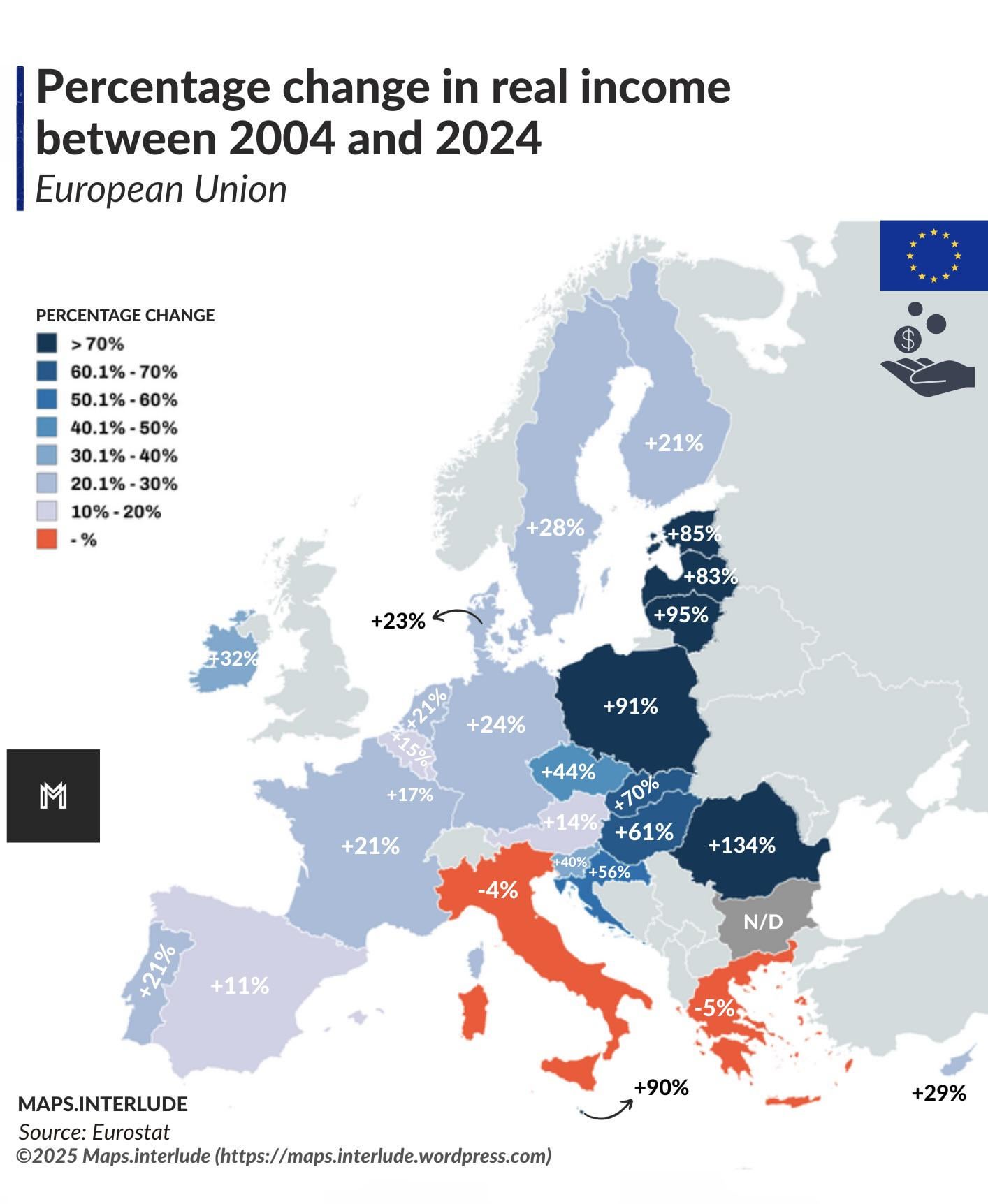 Percentage change in real income between 2004 and 2024 by quindiassomigli Tags:latvia 4 comments Ä, dzÄs arÄ! Ir taÄu #vissslikti F ItÄlijai JÄ, man arÄ« it kÄ 500 eur vairÄk nekÄ 4.5 gadus atpakaļ pielikuÅ”i. Bet nejÅ«tas vispÄr un pÄc inflÄcijas kalkulatora sanÄk vien tÄda pati pirktspÄja.š¤·āāļøš„² EU KohÄzijas fonds laikam kko dara šāāļø Comments are closed.