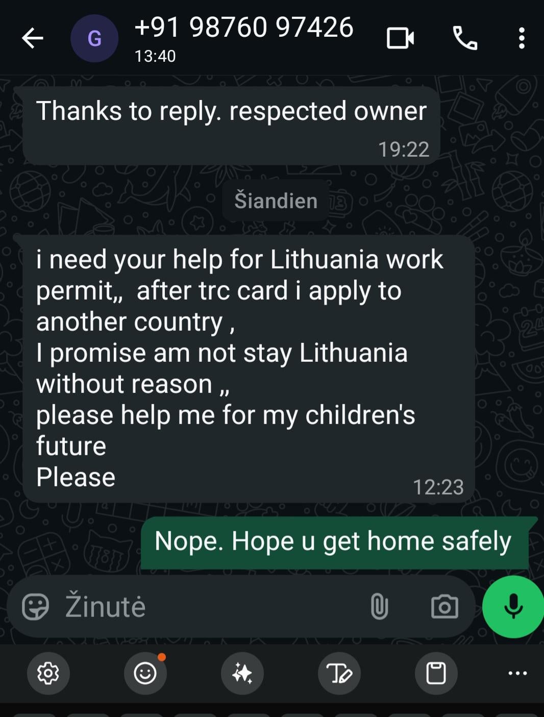 Pakistano musulmonai ir indai per discord'a perka lietuvos įmonių, užsiėmančių pavežėjimo, smulkaus remonto, maisto pristatymo, statybų sektoriaus paslaugomis, direktorių darbinius ir asmeninius numerius, ir nusipirkę duomenis, per whtapp grupchata rašinėja visiems. Žada pigesnį darbą vengiant mokesčių, svarbu kad patekti į šalį su darbo leidimu. Kiek žinau jau yra naivuolių, ir tų pačių pakistanų įsitvirtinusių čia kurie priėma į darbą, tačiau atimamas pasas, nes neatėmus darbuotojai ilgai neužsibūna.