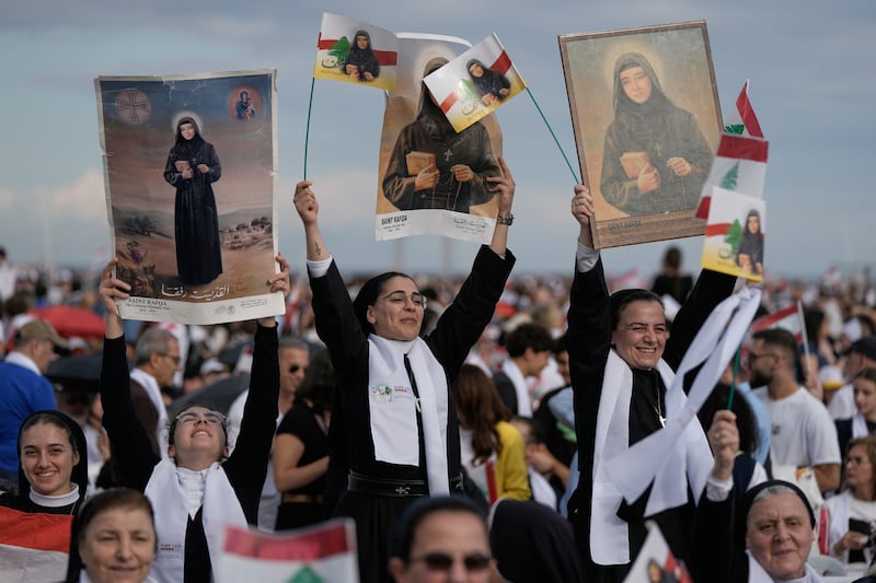 Nuns hold up images of Lebanese Maronite nun Saint Rafqa as they wait for Pope Leo XIV to celebrate a Holy Mass at Beirut waterfront, in Beirut, Lebanon, Tuesday, Dec. 2, 2025. | Bilal Hussein, Associated Press
