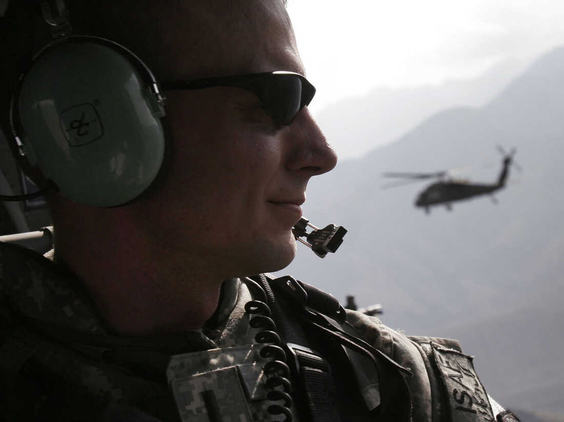 A U.S. crew member of a U.S. military helicopter looks out as they head from Nuristan province to the U.S. air base at Bagram, Afghanistan.