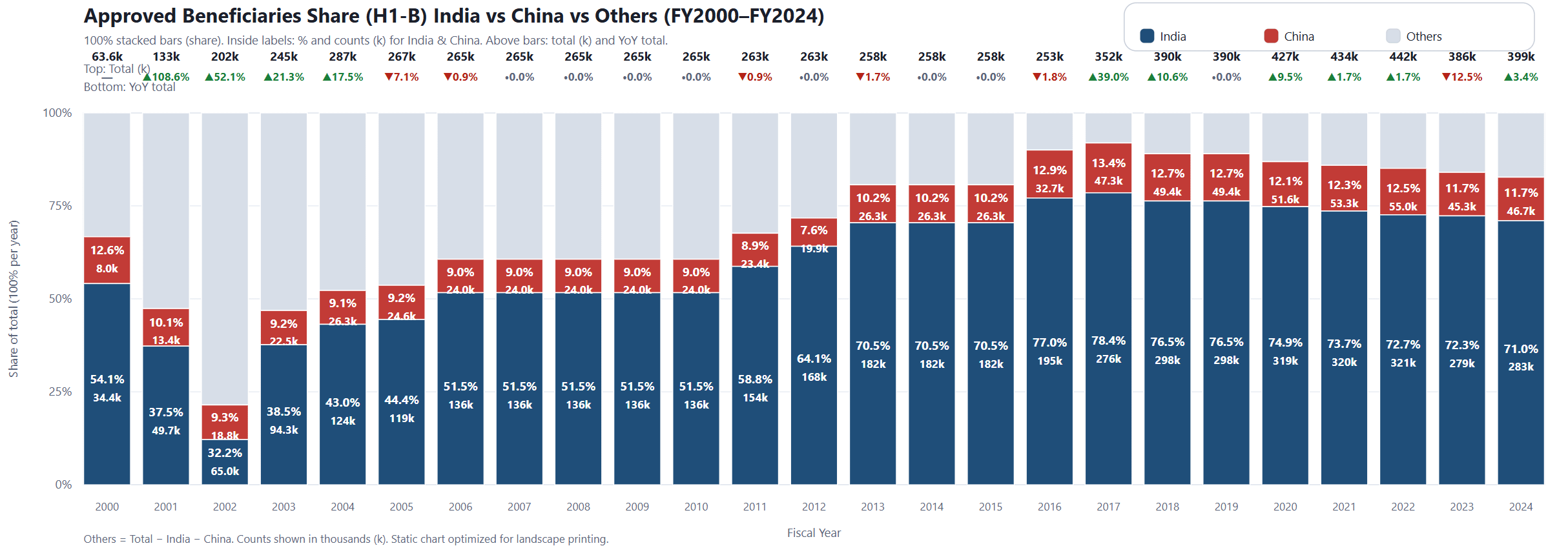 [OC] Active H1-B Visa Holders in the U.S. by Country of Origin (FY2000 – 2024)