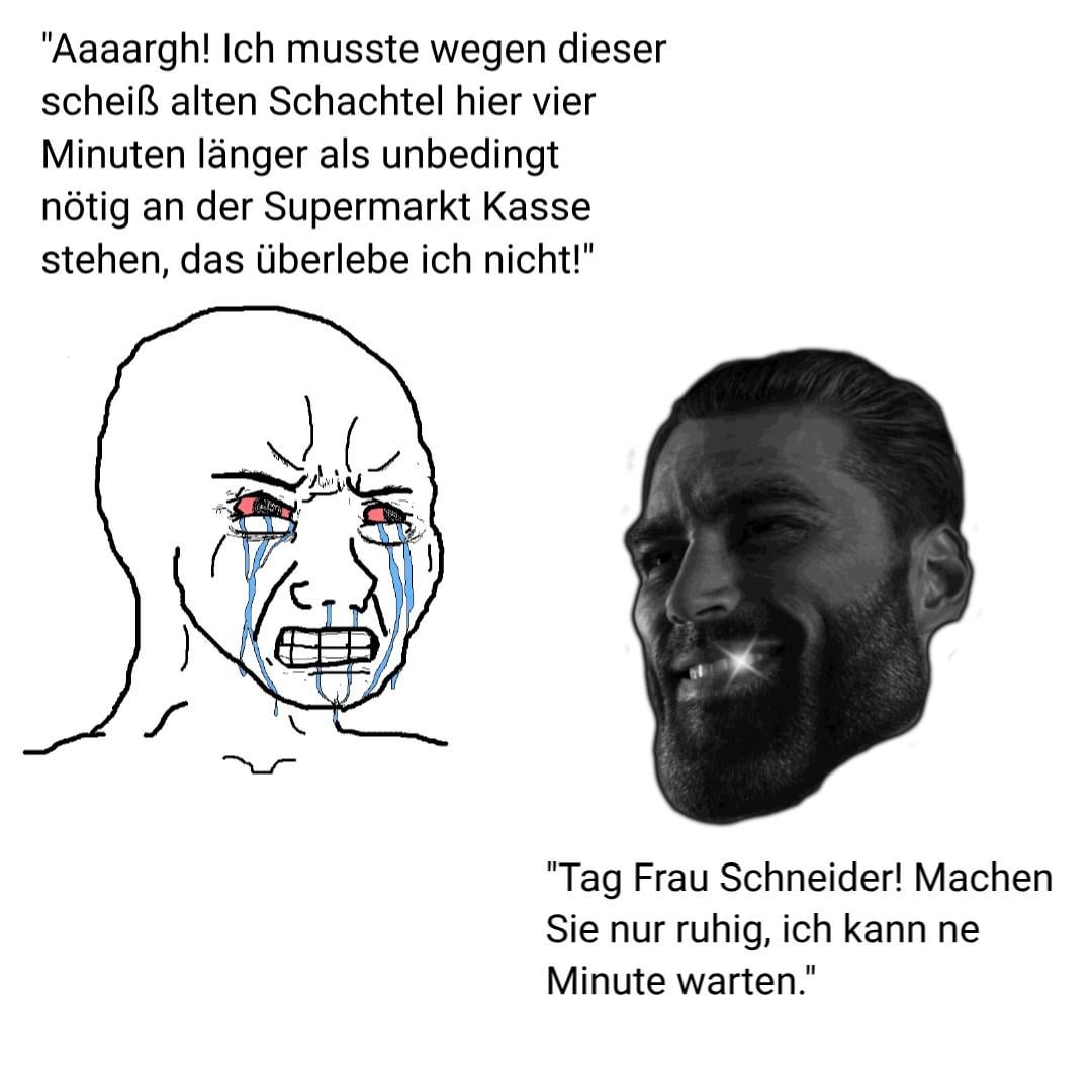 Also ich hab nichts per se gegen Rentner und wenn’s einmal vorkommt ist das auch ok. Mein problem ist, dass der nächste Supermarkt direkt neben einen Altenheim steht. Egal zu welcher Uhrzeit hast du einfach 5 Rentner vor dir. Das ist schon sehr bitter, wenn ich mir einfach mal kurz ein belegtes Brötchen kaufen will. Ich könnte manchmal sooooo abkotzen. Ganz besonders, wenn zusätzlich noch dieser eine Kiffer Azubi Kassendienst hat