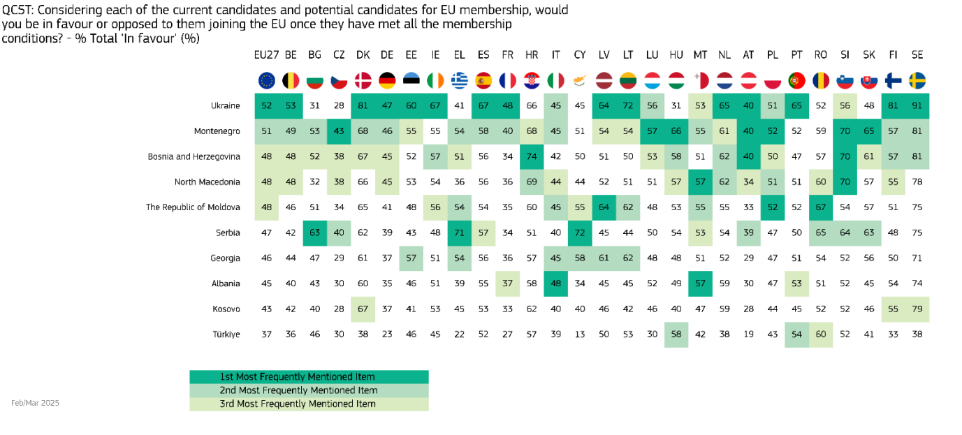 At the same time, overall support for Ukraine’s accession has been declining. In 2022, 66% of EU citizens supported Ukraine’s accession once it was ready; in 2023, 61% supported its candidate status; in 2024—60%; and by 2025 only 52% of Europeans supported Ukraine’s accession to the Union.