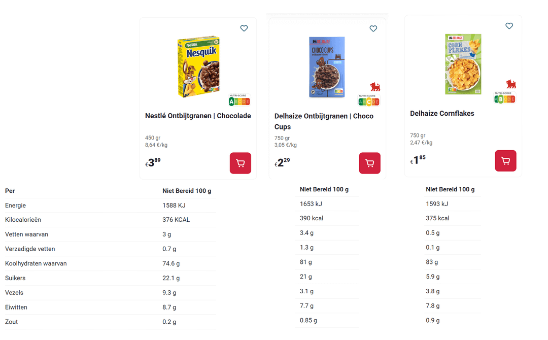 The ontbijtgranen one is pretty accurate though? Delhaize has more carbs, saturated fats, salt and fewer fibers and protein than the Nesquick option.