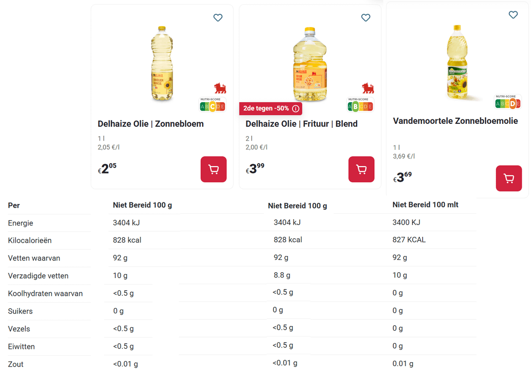 The nutriscore is based on some calculation. But there seems to be very little difference between the sunflower oils you show so I don’t understand this, either. In fact the most healthy sunflower oil is high oleic sunflower oil, because it contains much less omega 6 fatty acids. But that’s not taken into account for the nutriscore. In Colruyt they sell this oil as odourless, without even mentioning the health benefits compared to regular sunflower oil.