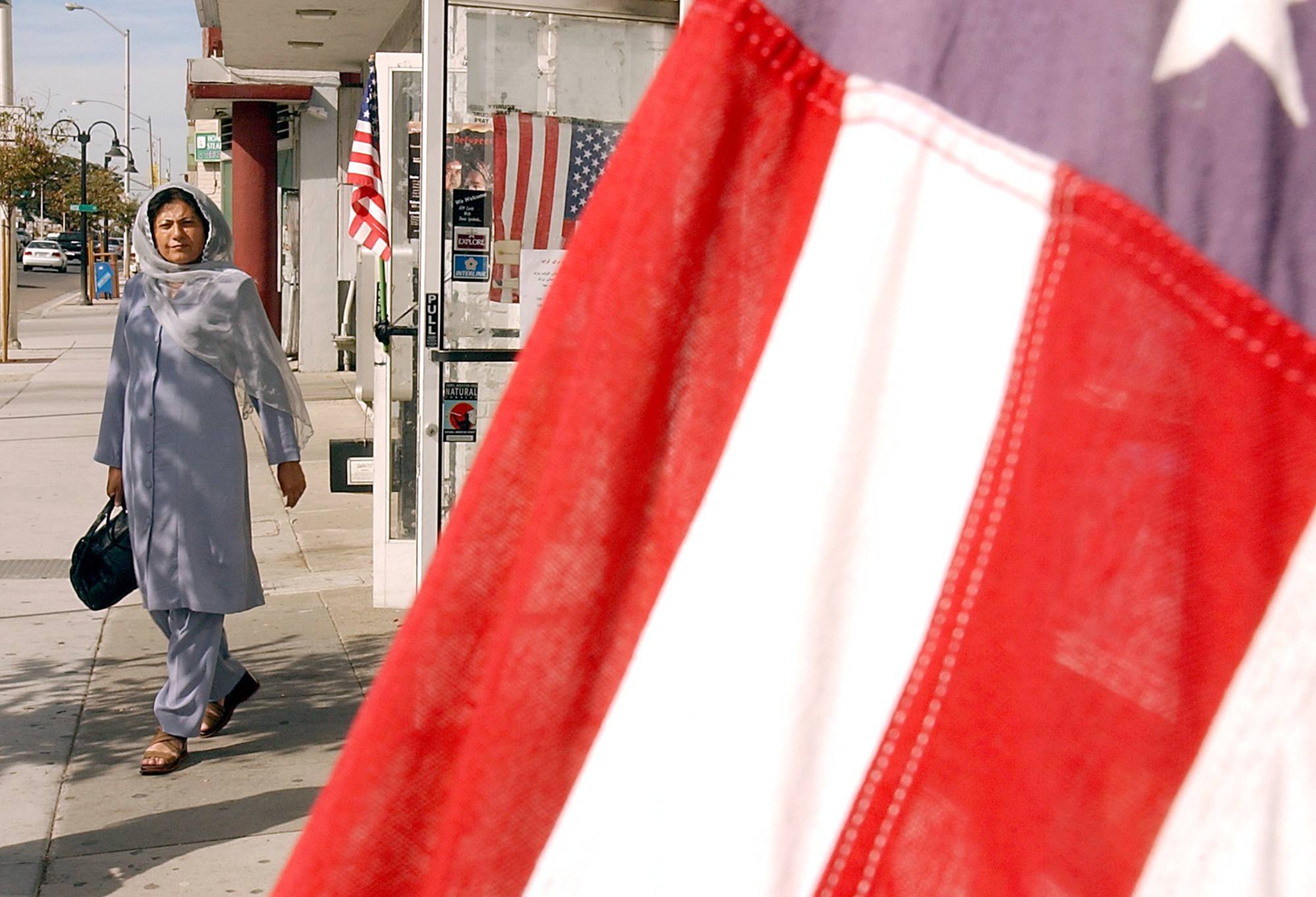 An Afghan American woman walks past an American flag October 24, 2001 in the “Little Kabul” district of Fremont, CA. Fremont has the largest Afghan community in the United States. (Justin Sullivan/Getty Images)