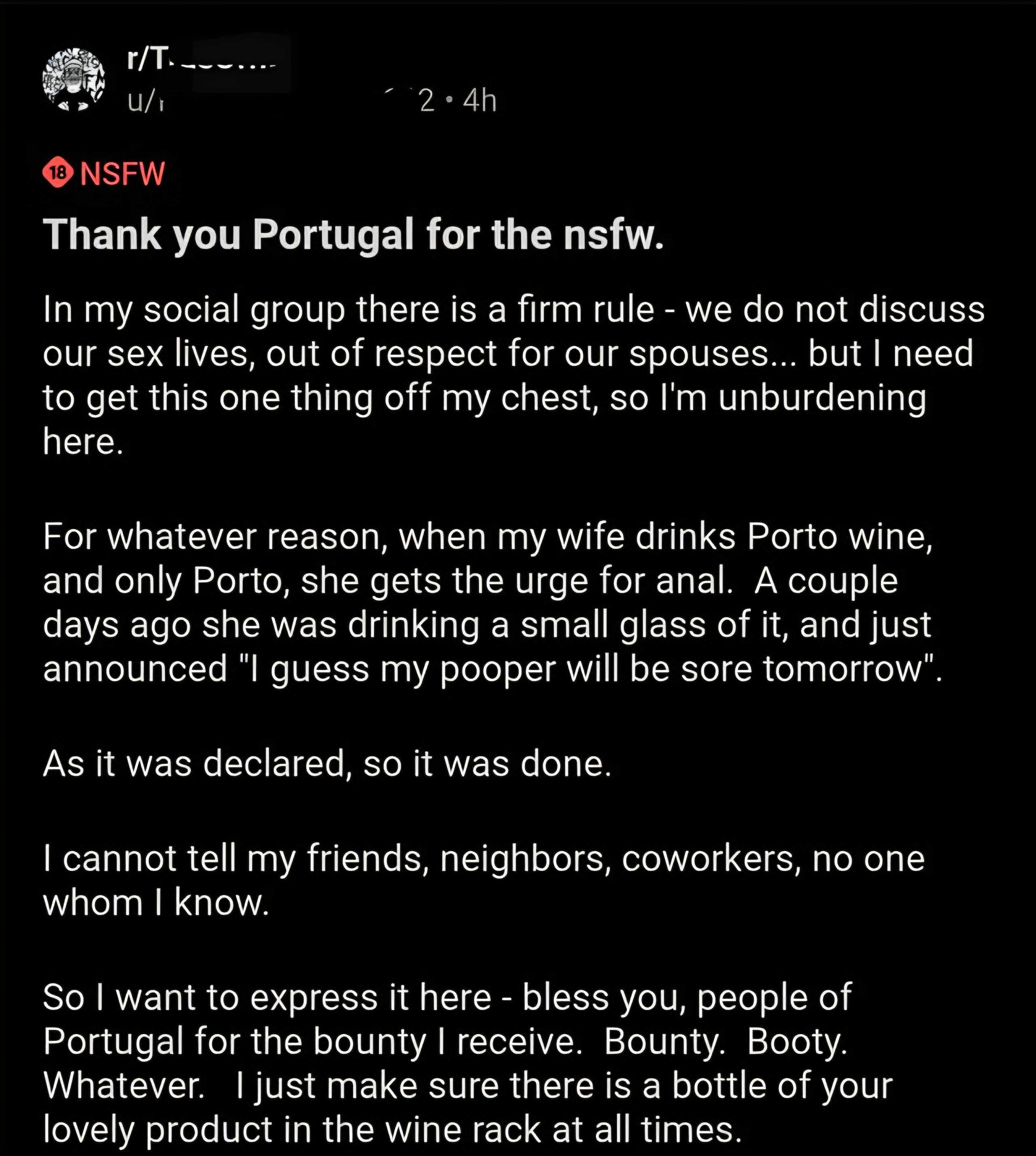 I had my wife drink all colours of Port and she still won’t let me stick it her arse…