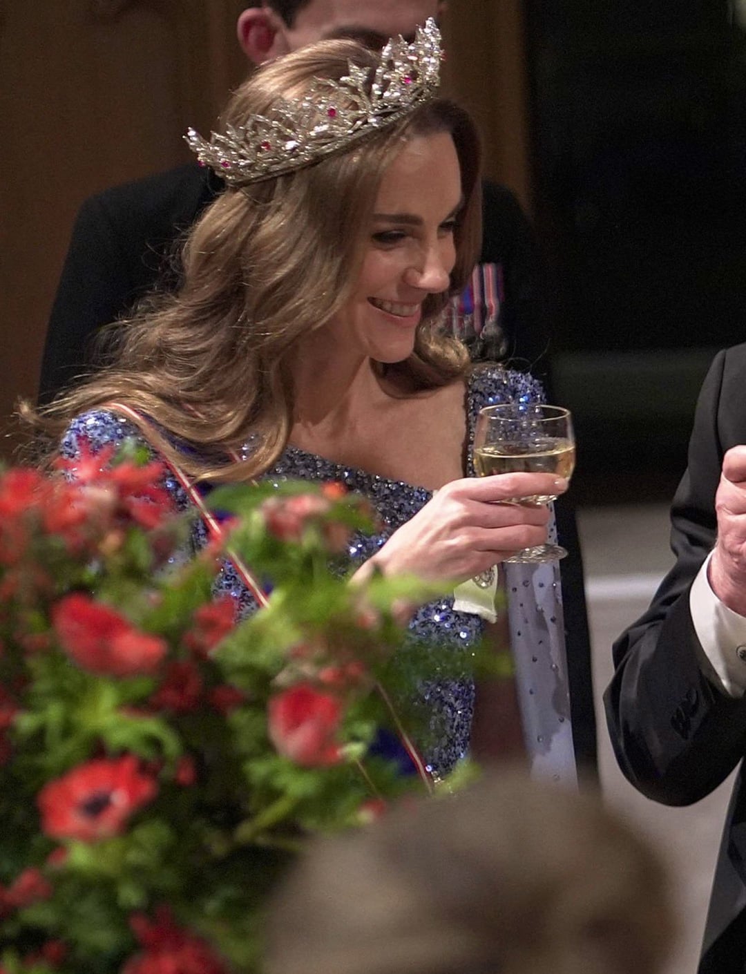 The tiara was also a favourite of the Queen mother, and when she died, QEII only wore it once. Seeing its glittering white diamonds and red rubies again with the POW’s blue gown is quite special for the history and jewellery nerds.