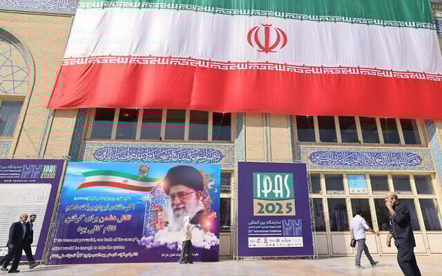 Iranians walk past a poster featuring Iranian Supreme Leader Ayatollah Ali Khamenei outside the venue of the 22nd Police and Security Equipment Exhibition at Imam Khomeini Mosque in Tehran on October 15, 2025. (ATTA KENARE/AFP)