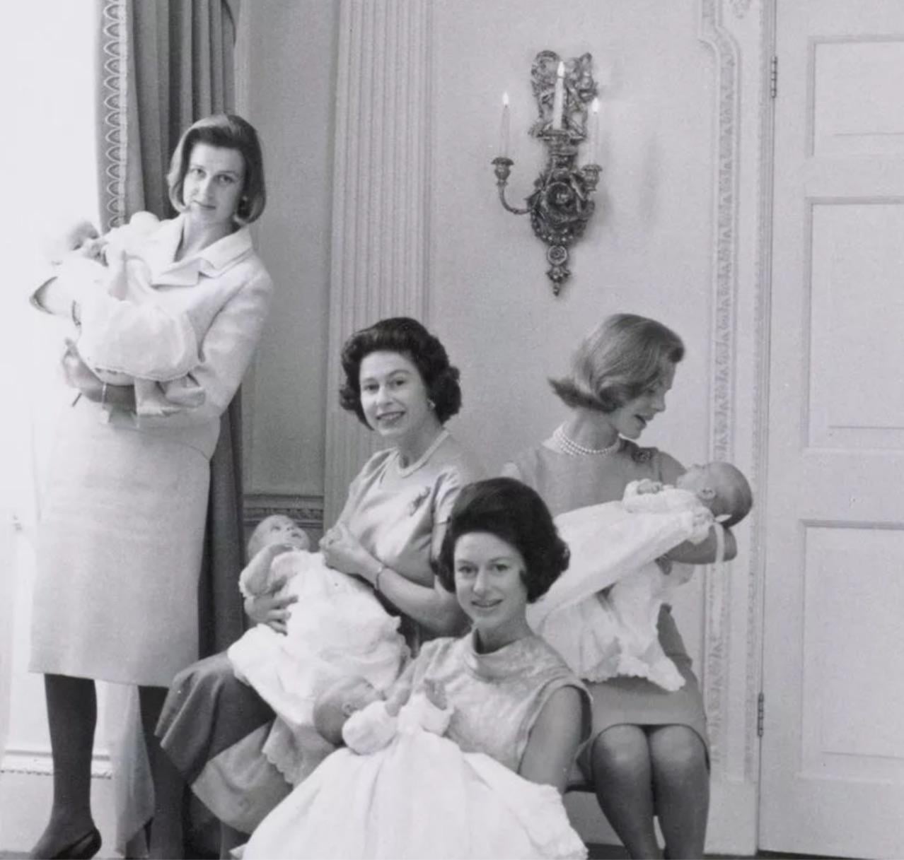 Queen Elizabeth II, Princess Margaret, Princess Alexandra, and the Duchess of Kent in 1964 with their new babies. Taken by Margaret’s husband Anthony Armstrong-Jones.