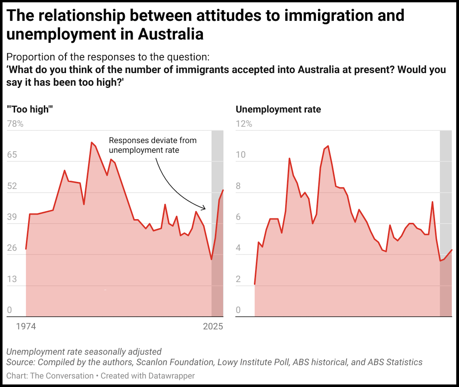 Generally, when unemployment rises, so does the number of Australians who feel migrant numbers are “too high”. One such cycle occurred in the early 1980s when unemployment, especially youth unemployment, rose sharply.