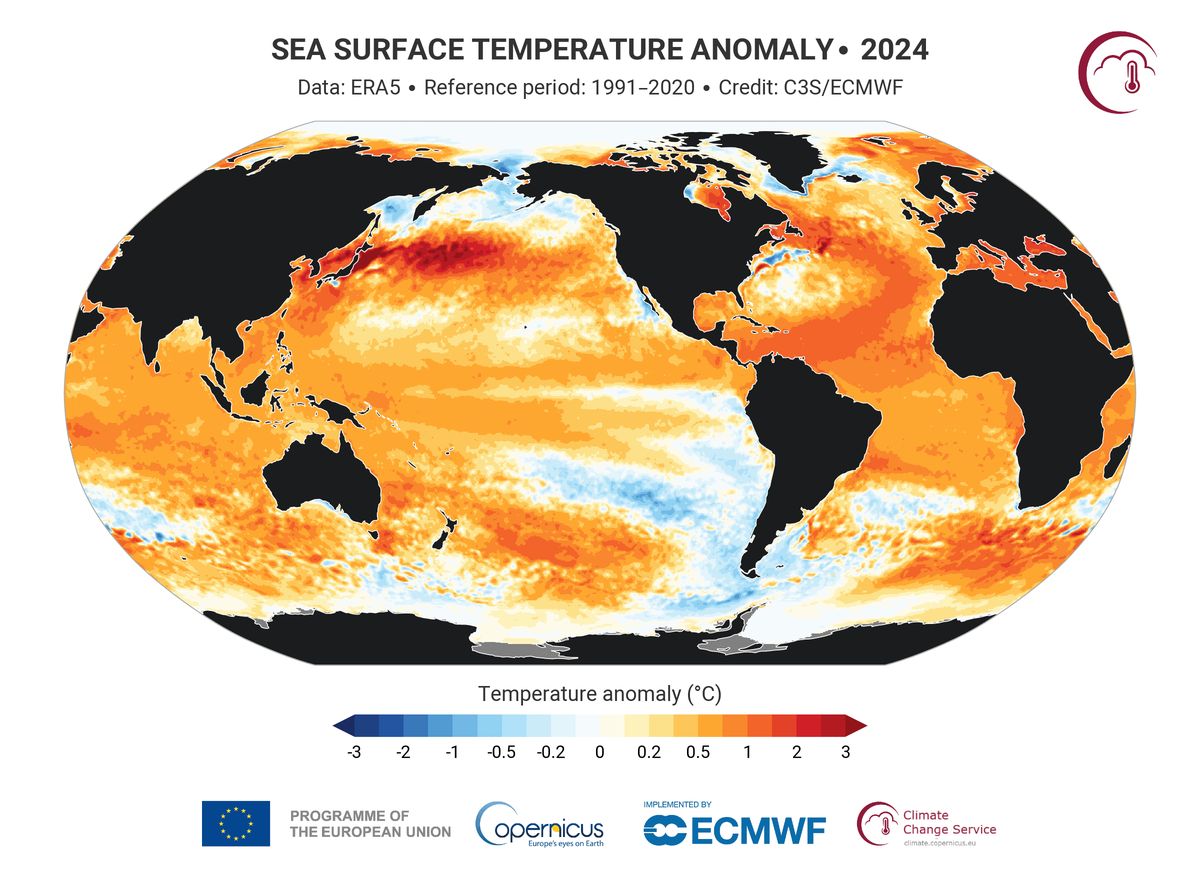 Teplotní anomálie povrchové teploty oceánů v roce 2024