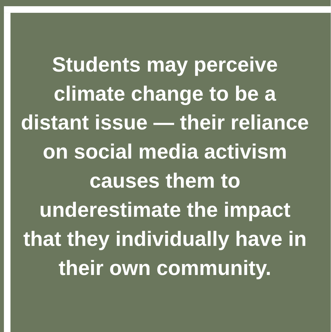 These social media posts, although important to evoke empathy for the situation, showcase events that occur in distant regions of the world and are beyond the viewer’s control. Students may perceive climate change to be a distant issue — their reliance on social media activism causes them to underestimate the impact that they individually have in their own community.
