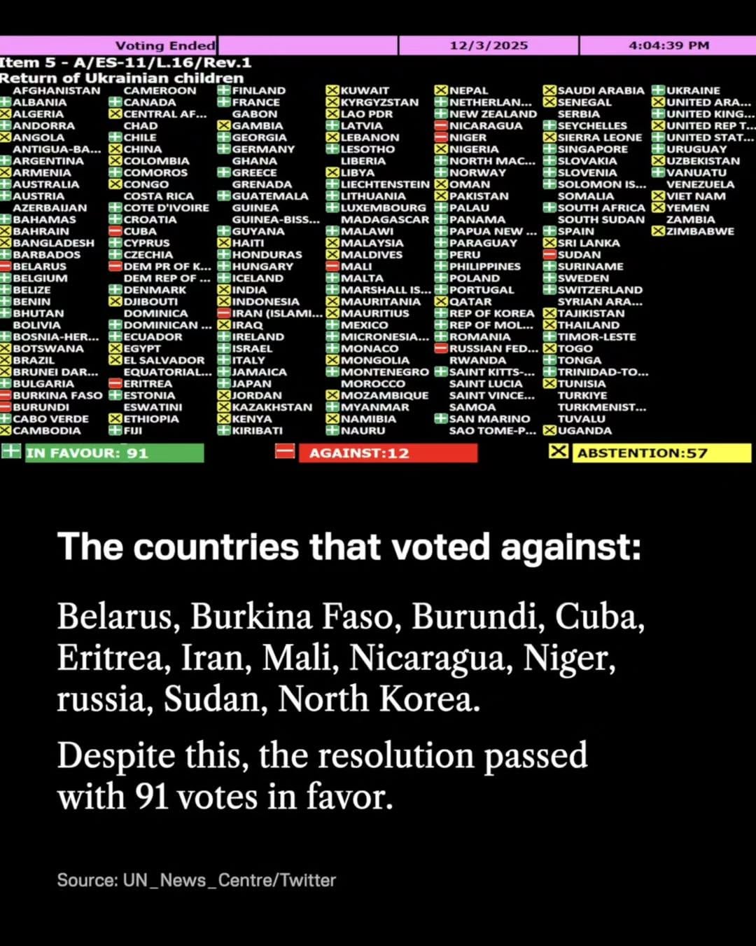 Even more interesting: 57 abstentions. UN equivalent of ruzzians saying “I’m not interested in politics”, except these are UN delegates representing their country’s populations to the world. What does that tell you about the UN these days? Or the state of world affairs in general?