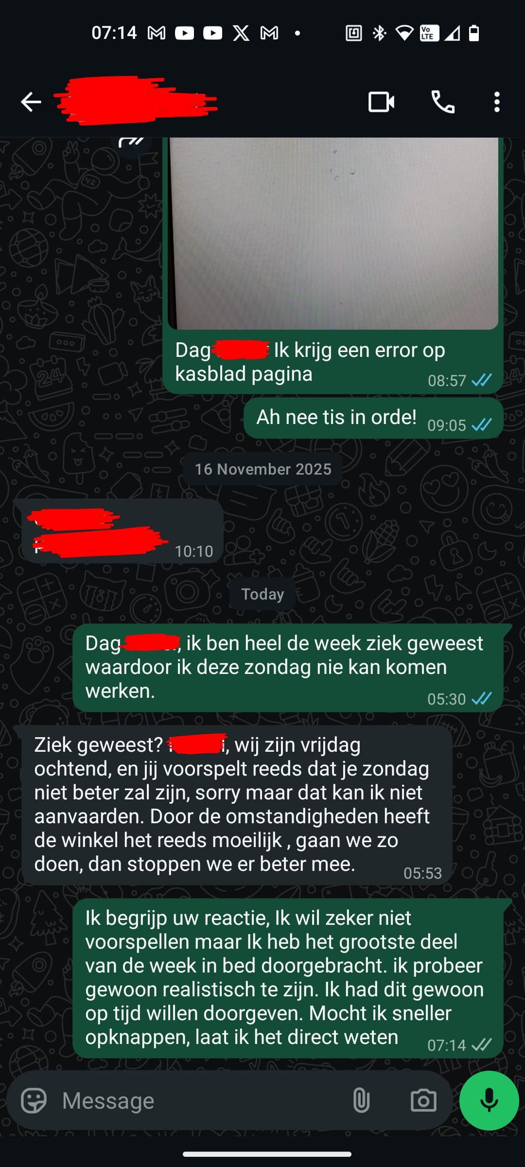Itâs a shop, and itâs the busiest time of the year. So, it seems quite normal that your boss gets upset on Friday. From the texts Iâve seen, I imagine youâre relatively new and probably your first job. You sent the wrong text. You shouldnât have said you were sick for an entire week. You should have said youâre sick and canât come because it doesnât make sense what you wrote. Thereâs no mention of you still being sick in the initial message. What I read in the initial text is that you were sick all week, are feeling better, and are giving no reason why you canât show up on Sunday. âZiek geweestâ means youâre not sick anymore. đ
