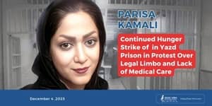 Parisa Kamali, a political prisoner held in Yazd Central Prison, has entered the tenth day of her hunger strike. She began a wet hunger strike on 24 November 2025 (3 Azar 1404) in protest against the “disappearance of her case file,” the suspension of judicial proceedings, and the denial of essential medical treatment. According to informed sources, Kamali suffers from toxic thyroid disease, which causes rapid heartbeat, severe weakness, tremors, and breathing difficulties. Prison doctors had repeatedly emphasized that her condition requires specialized treatment outside the prison, yet no action has been taken. After she began her strike, prison authorities transferred her to the quarantine ward — a measure often used to apply psychological pressure and force prisoners to end their protests.