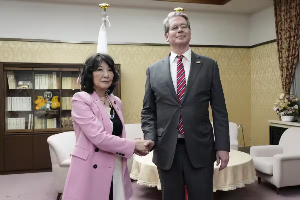 Finance Minister Satsuki Katayama (left) shakes hands with US Treasury Secretary Scott Bessent before their meeting. October 27, at the Finance Ministry in Tokyo (pool photo).