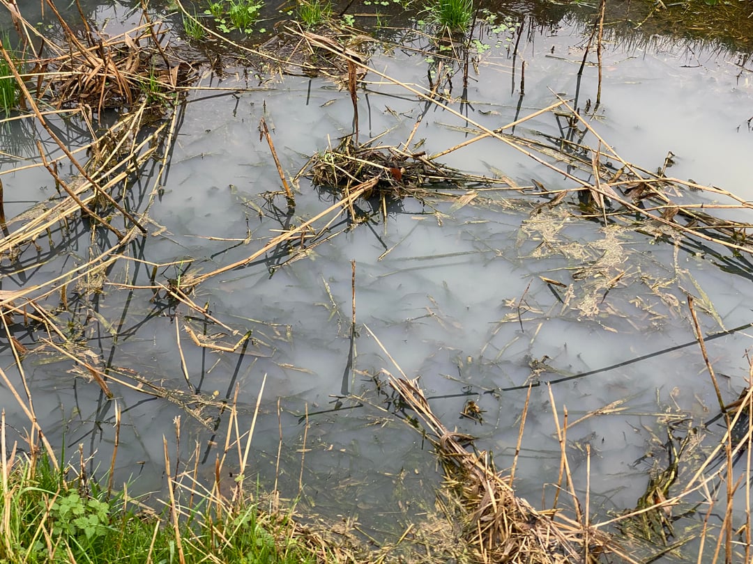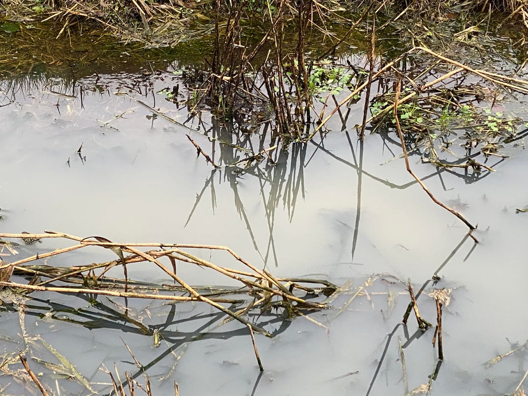 Seit über 3 Monaten ist das (stehende) Wasser in diesem Graben ein Stück unter der Oberfläche milchig trüb. Der Zustand hat sich in der Zeit trotz Regen nicht verändert.