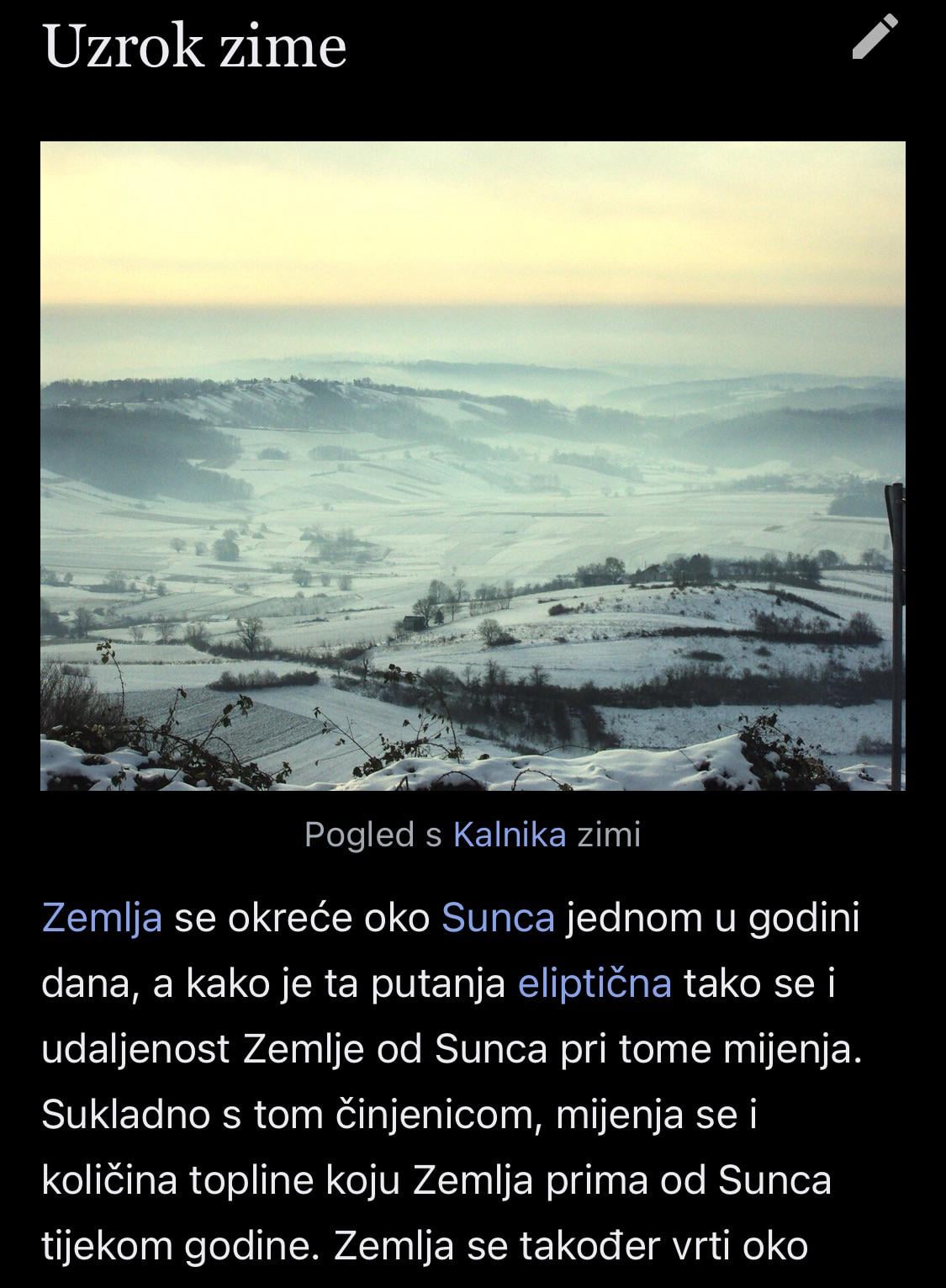 “Zemlja se također vrti oko svoje osi, koja je nagnuta za 23°27′ (23 stupnja i 27 minuta) u odnosu na ravninu kruženja oko Sunca. **Zima nastupa** kad je određena polutka (sjeverna ili južna) najmanje izložena Sunčevim zrakama, **neovisno o odaljenosti od Sunca**. Zima na sjevernoj polutki nastaje se kad je Zemlja najbliže Suncu, dok je tada na južnoj polutki vruće ljeto.”