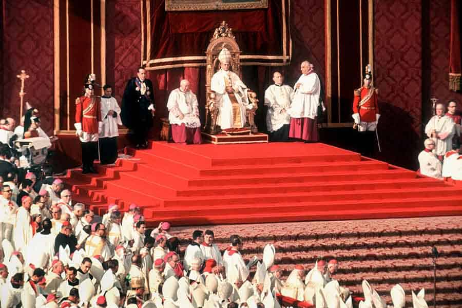 Pope Paul VI sits in the “cathedra” or bishop’s chair during the Second Vatican Council in July 1965 in St. Peter’s Square at the Vatican. (OSV News photo/Ernst Herb, KNA)