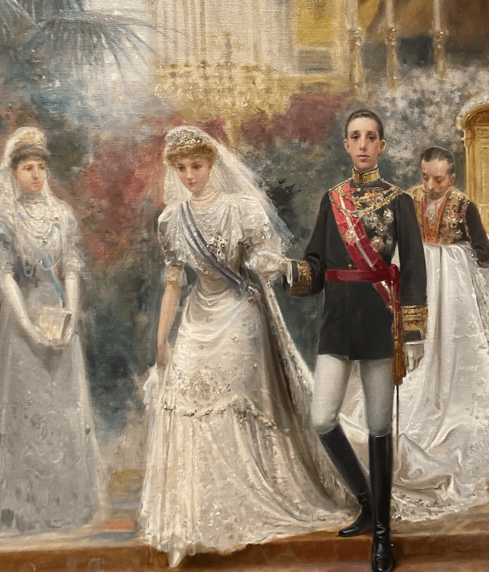 A second section explores her arrival in Spain and the marriage to Alfonso XIII in 1906, a ceremony remembered as much for its splendour as for the tragic bombing on Calle Mayor. The exhibition presents the contrast between the magnificence of the wedding procession and the chaos unleashed by the anarchist Mateo Morral’s attack, which left dozens dead but spared the king and his queen.