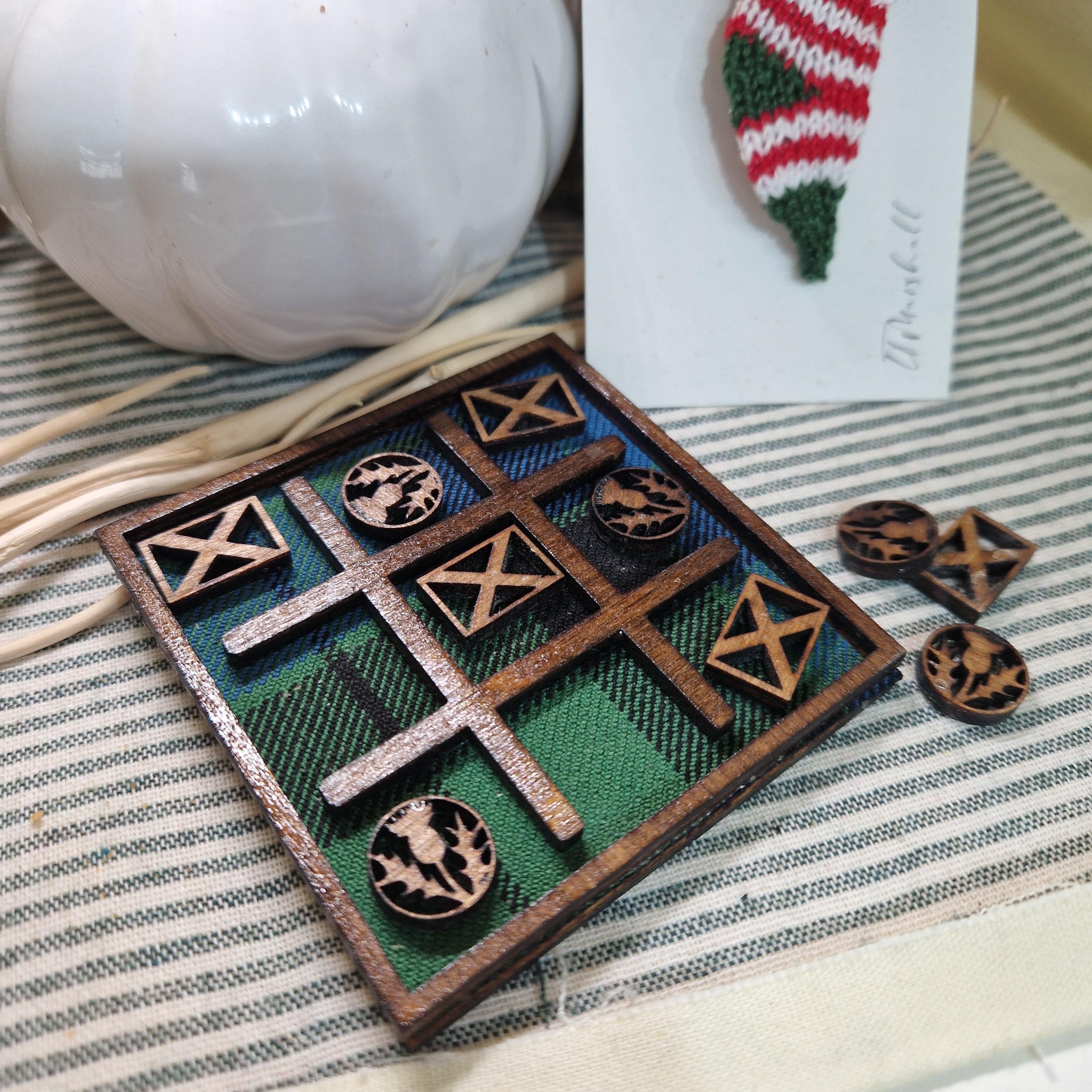 I’ve been playing around with some tartan scraps in my wee West Lothian craft corner and ended up making this Saltire & thistles game set. All the pieces are laser cut, and the backing is upcycled tartan from kilt offcuts.