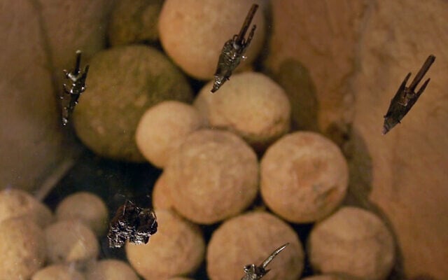 Hasmonean-period arrowheads and catapult stones on display at the Tower of David Jerusalem Museum. (Emil Aladjem, Israel Antiquities Authority)