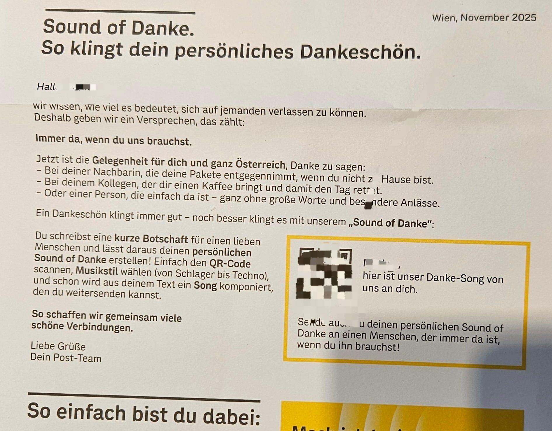 Hat noch wer den Brief bekommen, wo die Post einem einen "persönlichen" Song schickt als "Danke"?