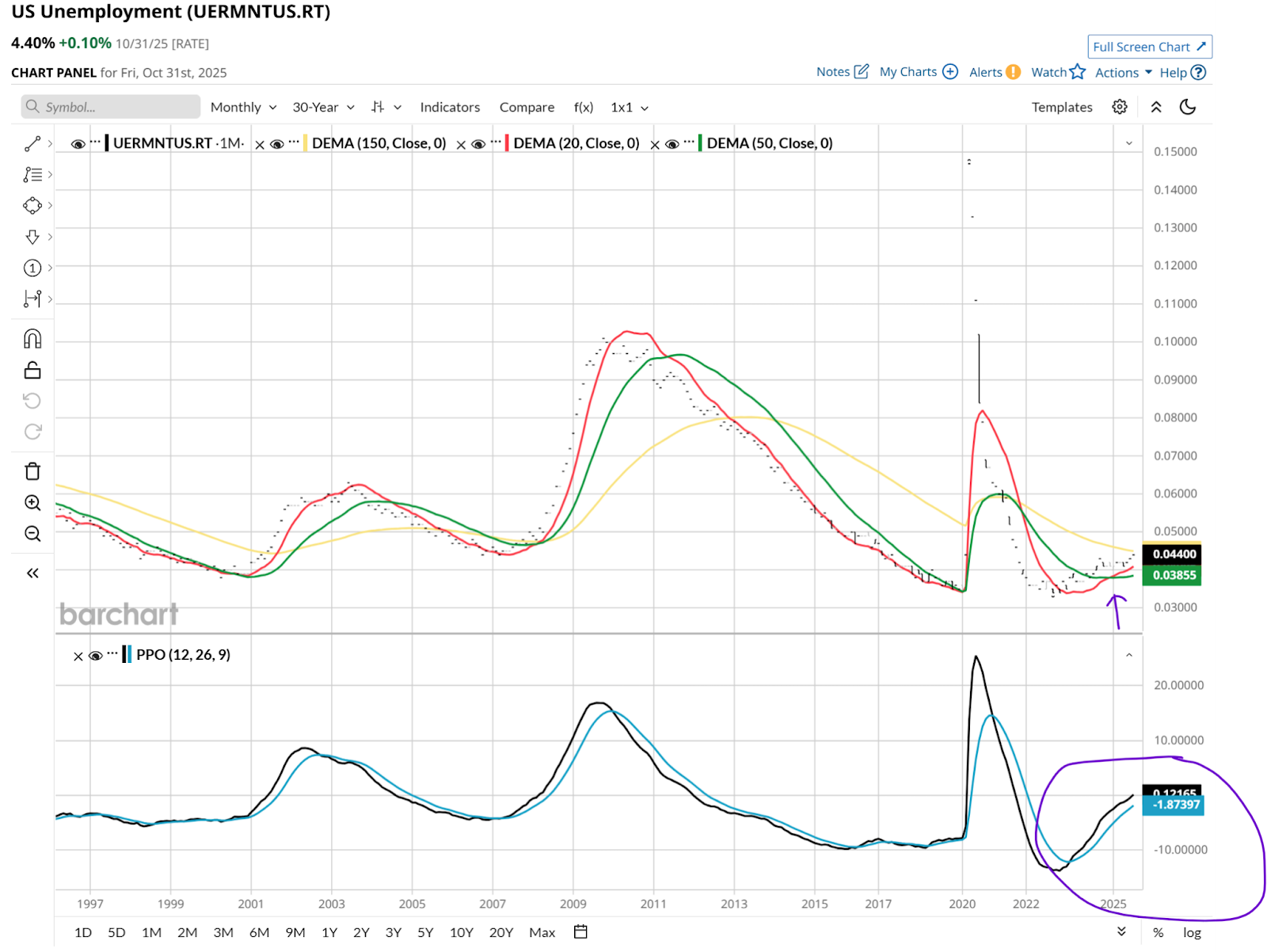 I don’t normally use my technical chart approach to analyze economic indicators. Those are usually best for stocks and ETFs. However, I can’t help but notice that for the first time in a long time, the U.S. unemployment rate is exhibiting “crossover” activity to the upside. That is, the momentum on both the 20-month moving average and Percentage Price Oscillator (PPO) indicator (at the top and bottom of this chart) are perking up, after a long dry spell. That spells higher unemployment. Enough to break the economy and in turn the bull market? We’ll see.