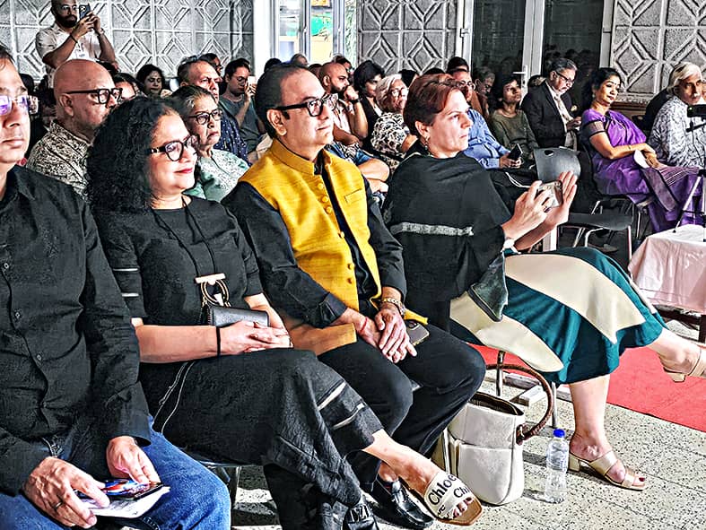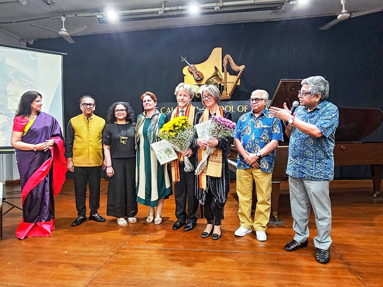 Calcutta School of Music president Jyotishka Dasgupta delivers the vote of thanks at the end of the piano recital by Duo Zubovas. At the extreme left is Chaitali Ganguly, head of CSM’s Western music and performing arts section