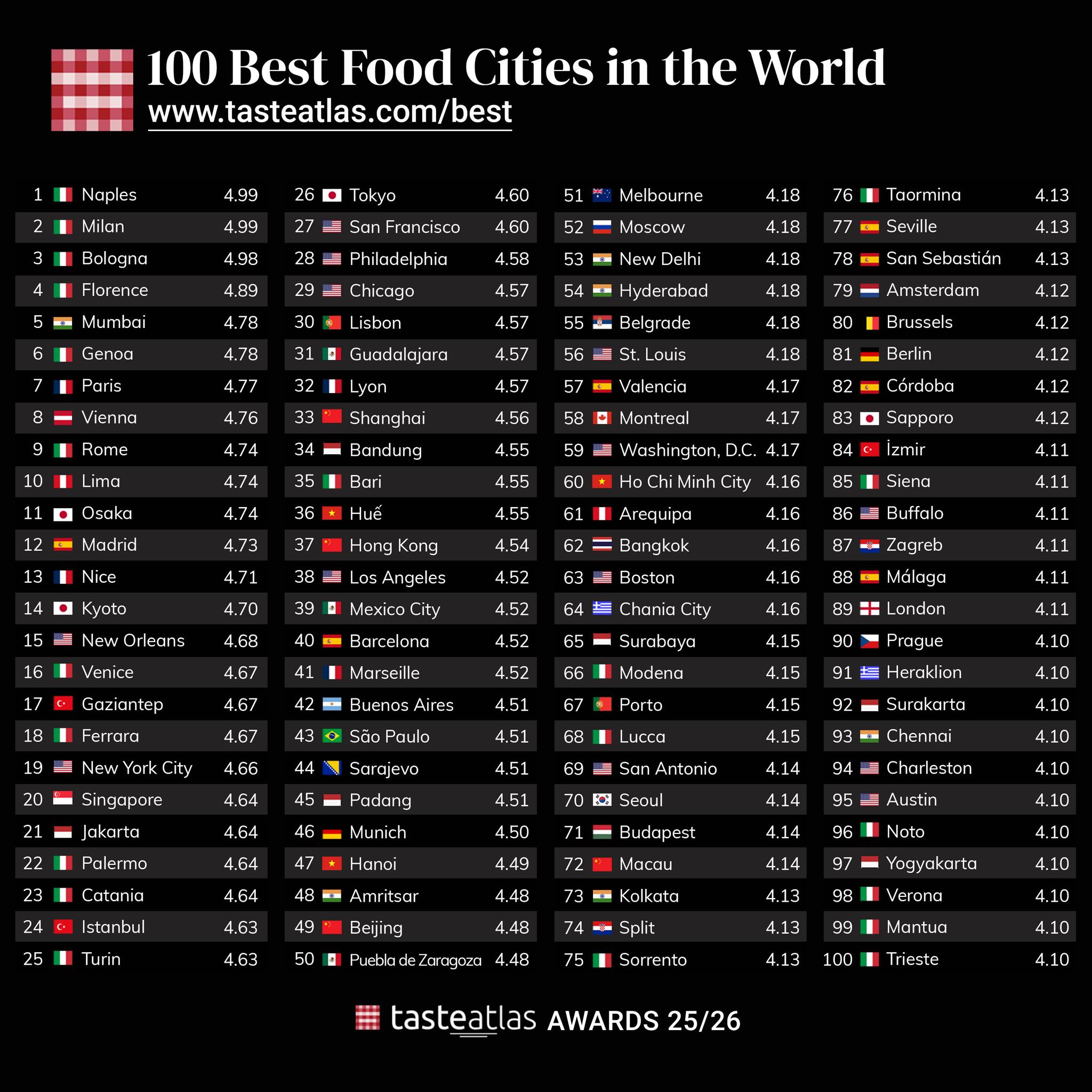 Italian cities dominate the list of the world’s best food destinations. Naples and Milan both scored 4.99, followed by Bologna (4.98) and Florence (4.89). Mumbai, India, rounds out the top five with a score of 4.78.