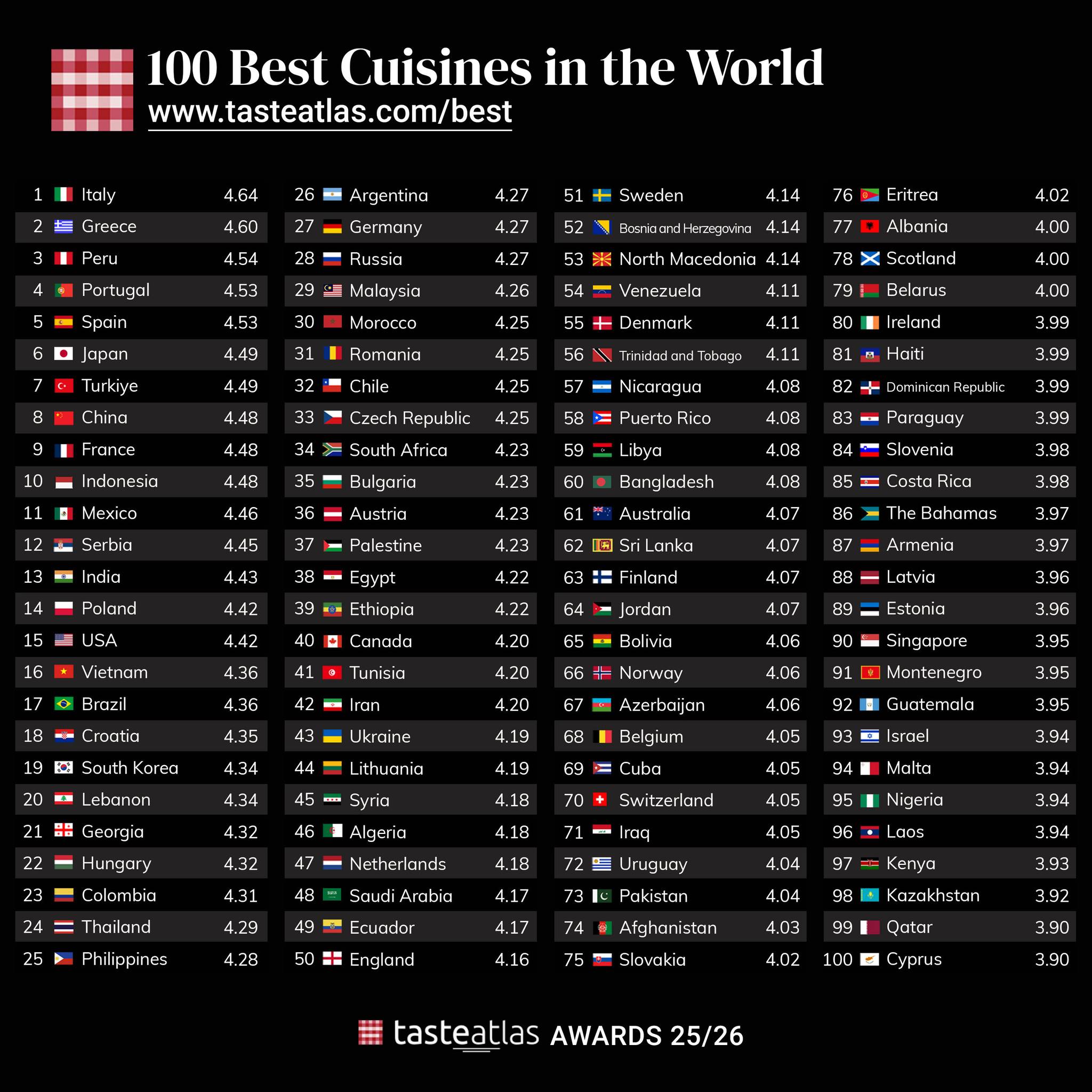 TasteAtlas awards are not merely a popularity contest. Each cuisine or region’s average rating is determined by the scores of its 30 to 50 best-rated dishes.