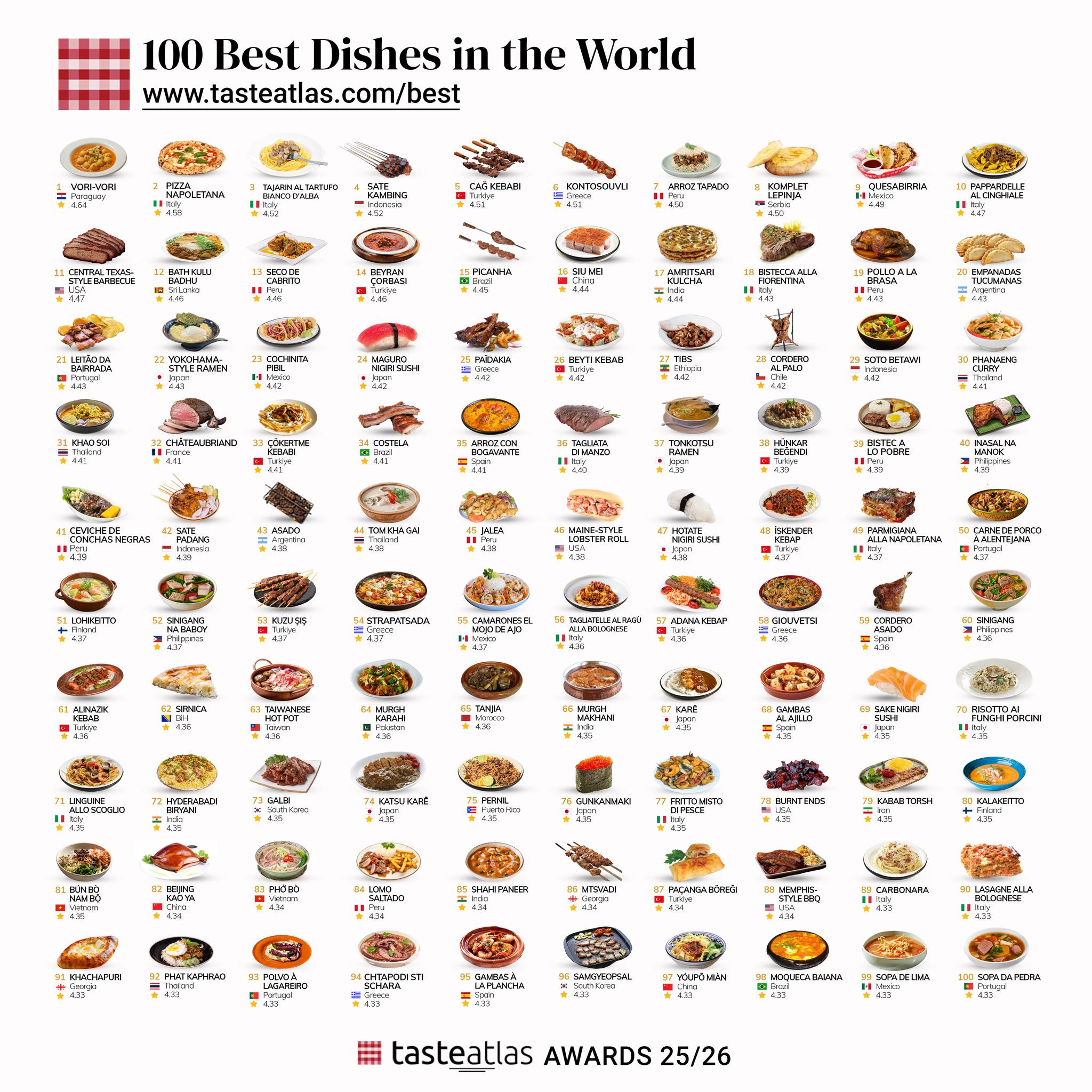 Italy is well represented with Pizza Napoletana (4.58) and Tajarin al tartufo bianco d’Alba (4.52). Other top dishes include Indonesia’s sate kambing (4.52) and Turkey’s cağ kebabı (4.51).