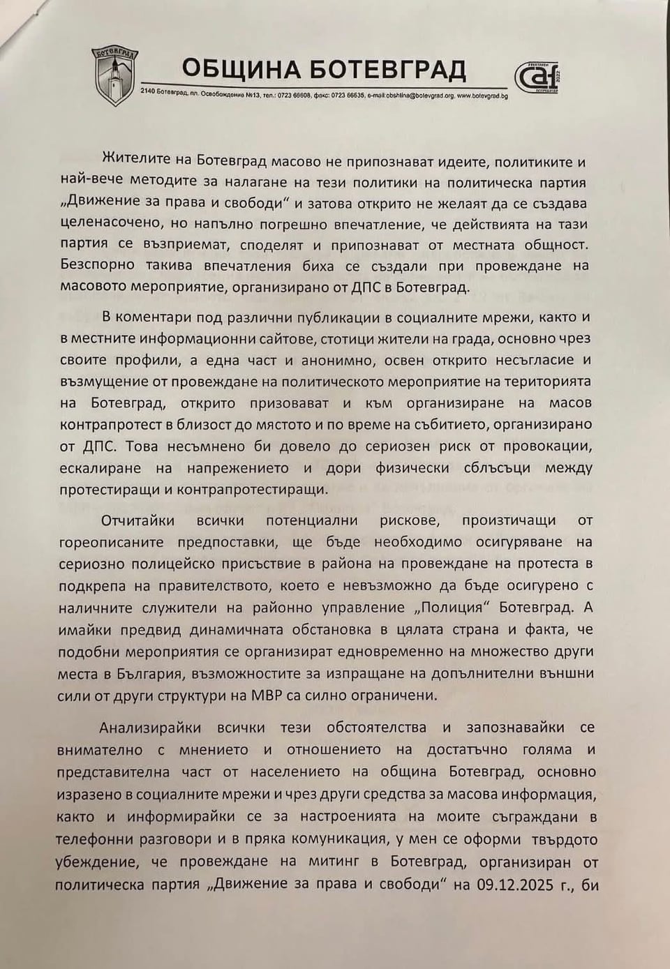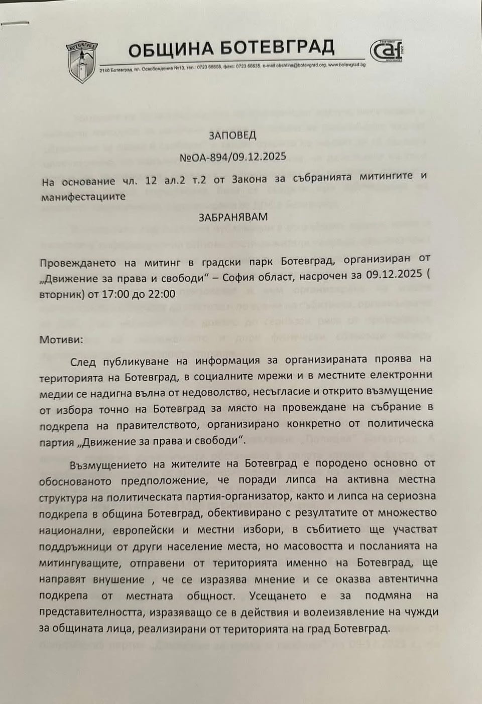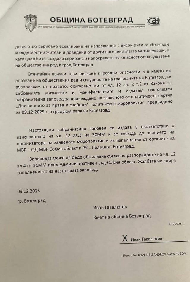 2. Това е много хубаво, обаче дали кметът си е вързал гащите да подкрепи тия мотиви с издържани обективни доказателства? Иначе се отваря за едно дело. Само да се окаже, че областният директор на МВР е на Пеевски и да пусне становище, че няма риск и проблем да се охранява протеста и става проблем.