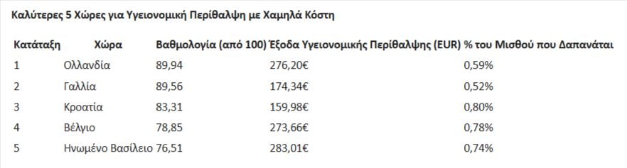 Η Ελλάδα συγκεντρώνει 23,6 βαθμούς σε σύνολο 100, με ετήσια δαπάνη 449,02 ευρώ και μέσο ετήσιο εισόδημα 13.565 ευρώ. Το 3,31% του εισοδήματος κατευθύνεται σε έξοδα υγειονομικής περίθαλψης, το υψηλότερο ποσοστό στη διεθνή κατάταξη.