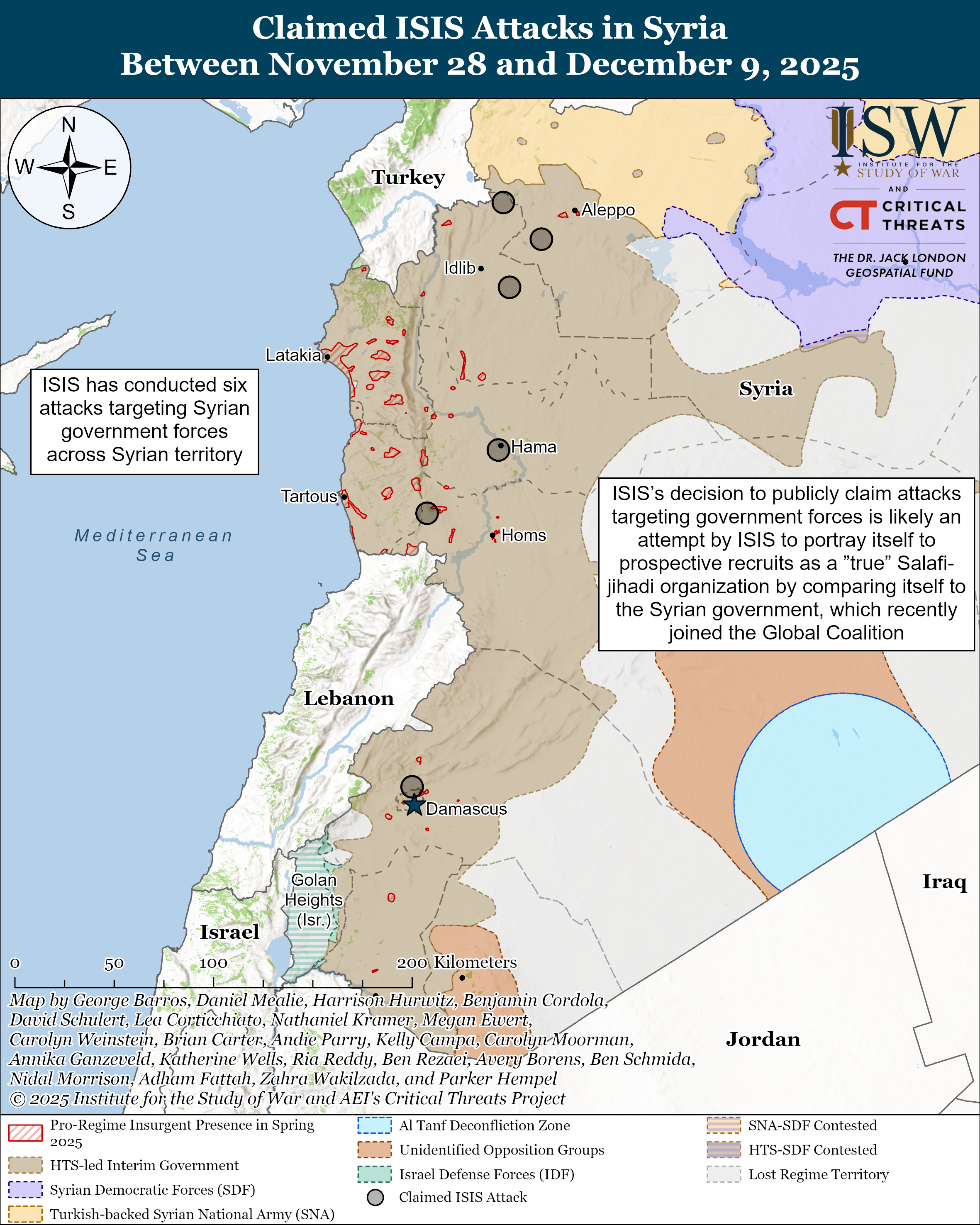 SDF Integration into the Syrian State: The Syrian government reportedly sent the Syrian Democratic Forces (SDF) a “revised” and “detailed” integration proposal on December 6 that likely Kurdish sources equated to the SDF’s “complete subjugation” to the Syrian army on Turkish terms. The SDF is unlikely to accept any proposal that requires Kurdish fighters to join the Syrian army as individuals, which decreases the likelihood that the SDF will integrate into the state by the end of the year under terms acceptable to the Syrian and Turkish governments.