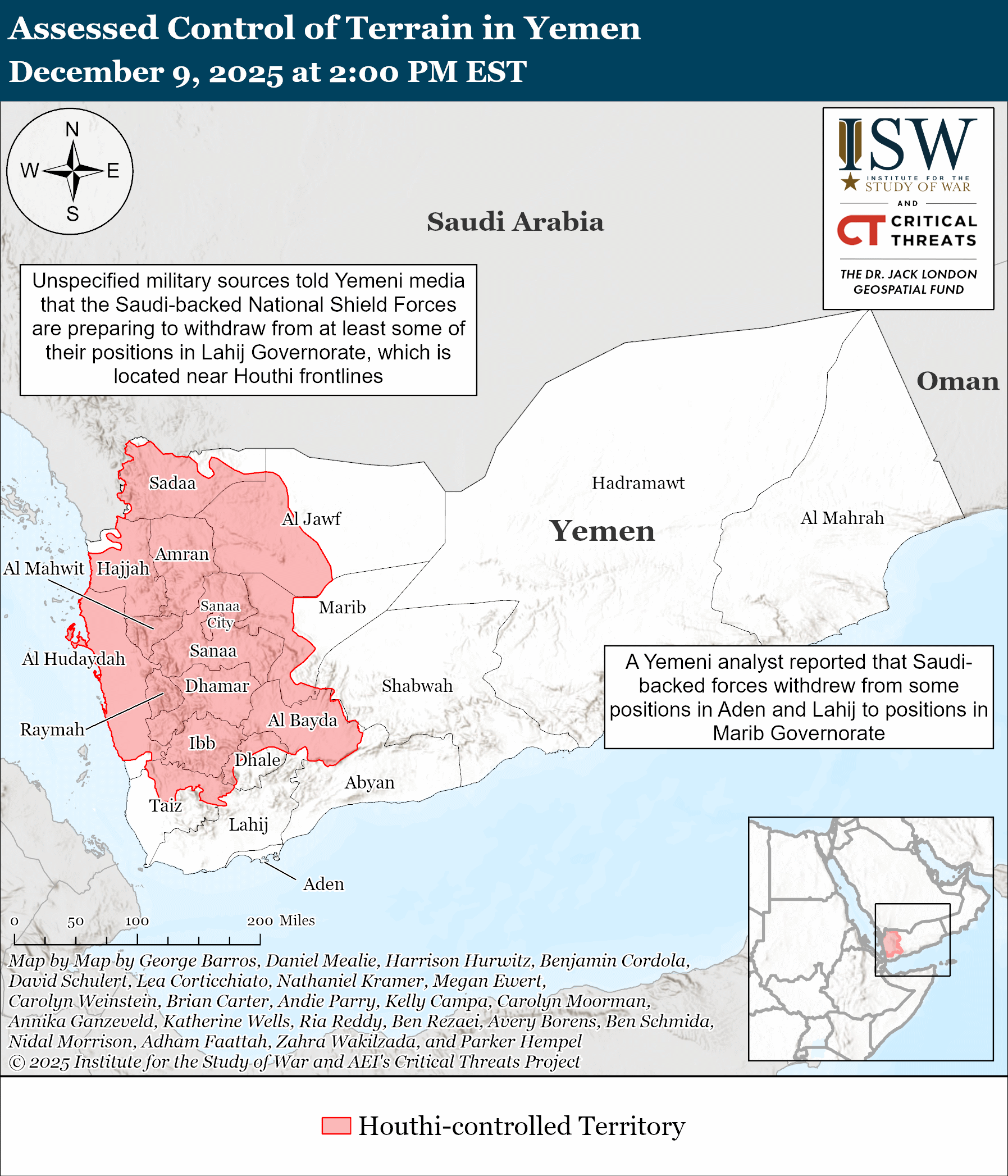 Saudi forces have continued to withdraw from positions in southern Yemen, including some positions near Houthi frontlines. Unspecified military sources told a Yemeni media outlet on December 8 that the Saudi-backed National Shield Forces (NSF) is preparing to withdraw from its positions in al Mudharabah and Ras al Arah districts in Lahij Governorate, which is near the Houthi frontlines.[xv]  A Yemen analyst reported that Saudi-backed forces withdrew from some positions in Aden and Lahij governorates to positions in Marib Governorate.[xvi] Marib is controlled by PLC Vice President and Marib Governor Sultan al Arada, who is a key Yemeni government loyalist and anti-Houthi military and political leader who has defended Marib against successive Houthi attacks by uniting the governorate‘s various communities against the Houthis.[xvii] The Yemen analyst added that Saudi forces have very likely also withdrawn from some positions in Mahra Governorate, including al Ghaydah Airport.[xviii] The STC will likely backfill these positions in Lahij, Aden, and Mahra governorates because they are located in southern Yemen, where the STC seeks to establish an independent state.