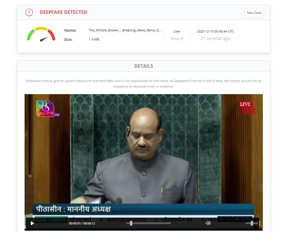 We scanned the segment on Deepware Scanner, which detected deepfake presence in the footage.