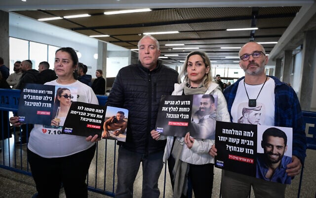 The parents had apparently been sitting quietly in the courtroom at the Tel Aviv District Court when a guard instructed them to go out. Footage from the courtroom showed several parents remonstrating with guards, insisting there was no reason for them to be ejected. There was some argument regarding claims that someone had held up a sign, which relatives forcefully denied, saying the signs were with them but had not been held up.