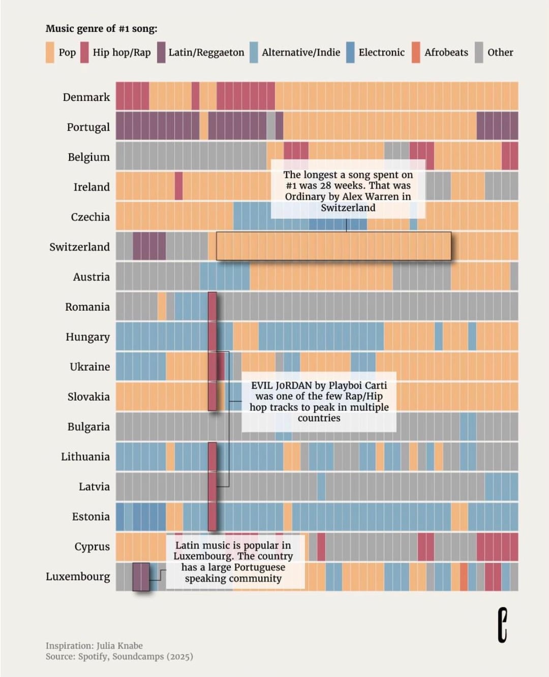There is only one country where electronic was dominant for a few weeks and only one country where afrobeats was dominant but like half of the chart is grey, wtf? There must have been some other more popular genre that you just didn’t put in there for some reason