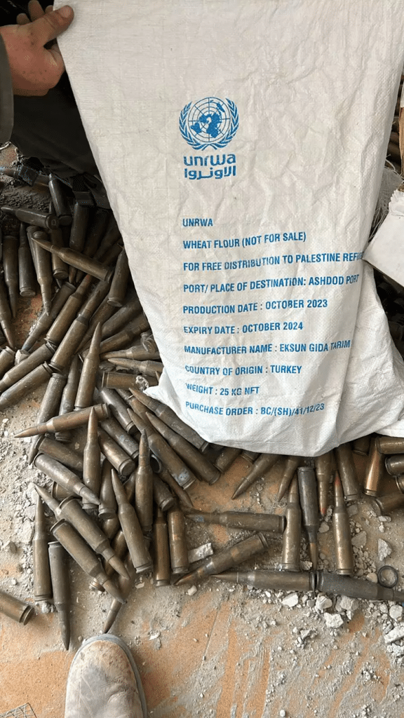 Cache of combat equipment found in UNRWA bags near civilian buildings (Photo: IDF)