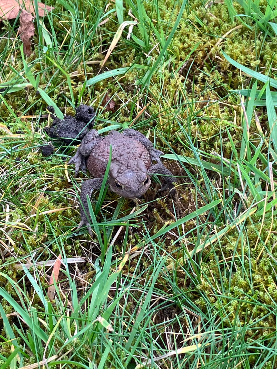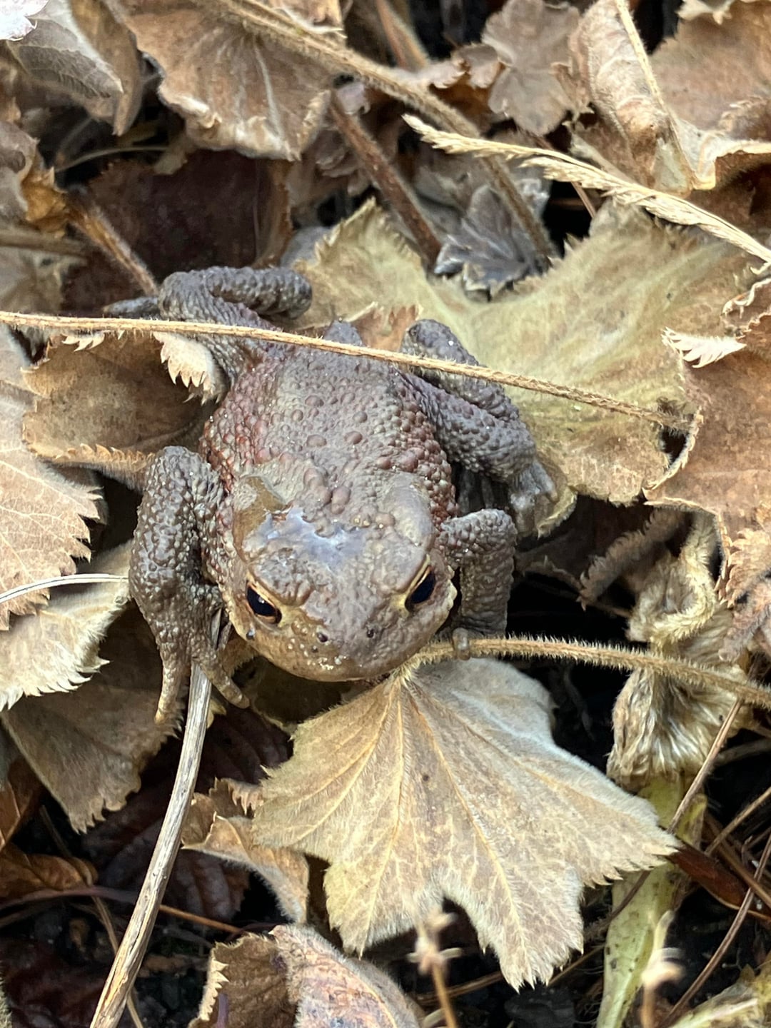 Das eine junge Erdkröte. Erdkröten sind im Garten gerne gesehen, weil sie Schädlinge wie Schnecken und Raupen fressen.