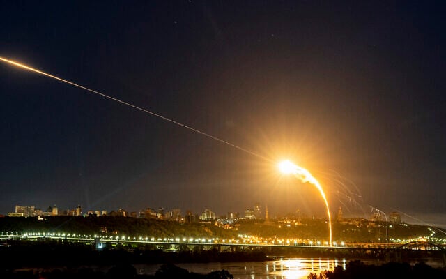 Ukrainian air defense intercepts an Iranian-made ‘Shahed’ drone mid-air in in Kyiv, Ukraine, May 30, 2023. (Evgeniy Maloletka/AP)