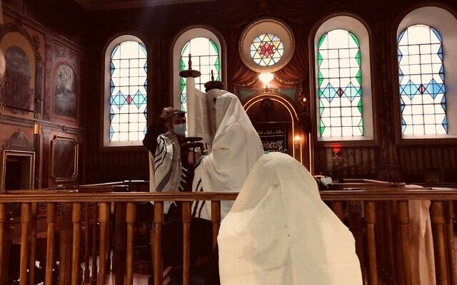 Rosh Hodesh (new month) prayers in Tsori Gilod Synagogue (also known as Beis Aharon V’Israel Synagogue) in Lviv, Ukraine, March 4, 2022. (Lazar Berman/Times of Israel)