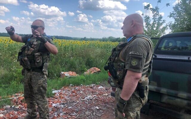 Members of the 128th Territorial Defense Brigade on the road to Eskhar, Ukraine, July 28, 2022 (Lazar Berman/The Times of Israel)